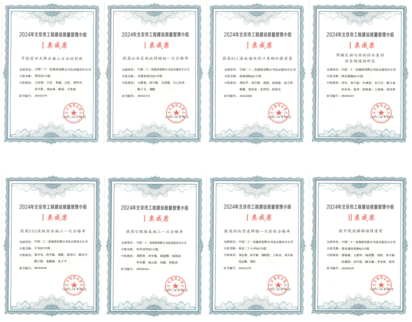 4月17日,在北京市建筑業(yè)聯(lián)合會組織的2024年度QC競賽活動中,崇建公司8項(xiàng)參賽成果全部入圍,最終獲得省部級一等獎7項(xiàng),二等獎1項(xiàng),時隔一年再次刷新了崇建公司在屬地化質(zhì)量管理活動競賽中的最好成績,其中一等獎獲獎數(shù)量超過了以往屬地化競賽活動一類獎項(xiàng)的總和,成果總體水平提升明顯。