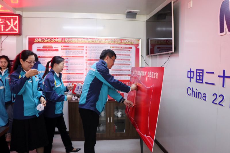在“學(xué)黨史”環(huán)節(jié),項(xiàng)目黨支部書記講授偉大抗美援朝精神專題黨課,帶領(lǐng)與會(huì)人員重溫中國人民志愿軍建立的不朽歷史功勛,并由中國二十二冶集團(tuán)時(shí)代置業(yè)公司黨委書記趙曉暉發(fā)放學(xué)習(xí)書籍《誰是最可愛的人》。在“悟思想”環(huán)節(jié),兩名優(yōu)秀黨員代表講解在抗美援朝戰(zhàn)役中革命英雄的感人事跡,全體與會(huì)黨員在心愿紙上寫下對(duì)黨說的心里話和工作行動(dòng)目標(biāo),并將其粘貼在黨員踐行板上表明決心。在“辦實(shí)事”環(huán)節(jié),中國二十二冶集團(tuán)一公司黨委副書記趙海濤為與會(huì)黨員佩戴黨徽,通過此舉充分發(fā)揮黨員干部先鋒模范作用,帶領(lǐng)廣大員工扎根一線,確保項(xiàng)目履約;同時(shí)設(shè)立黨員責(zé)任區(qū),中國二十二冶集團(tuán)設(shè)計(jì)院黨委副書記劉軍分別為開發(fā)、設(shè)計(jì)、施工三方黨員代表授牌,黨員代表作表態(tài)發(fā)言。在“開新局”環(huán)節(jié),項(xiàng)目管理人員帶領(lǐng)參會(huì)人員參觀施工現(xiàn)場(chǎng),重點(diǎn)講解開發(fā)設(shè)計(jì)理念、施工中運(yùn)用智慧化建造手段貫徹綠色施工理念的典型實(shí)踐和取得的重要成果。