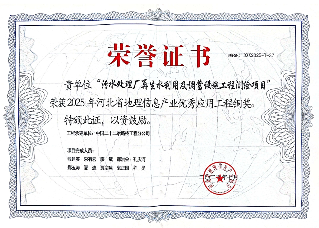 近日獲悉,在河北省地理信息產(chǎn)業(yè)協(xié)會主辦的權(quán)威評選中,路橋公司憑借“污水處理廠再生水利用及調(diào)蓄設(shè)施工程測繪項(xiàng)目”的卓越實(shí)踐,榮獲“2025年河北省地理信息產(chǎn)業(yè)優(yōu)秀應(yīng)用工程銅獎(jiǎng)”。